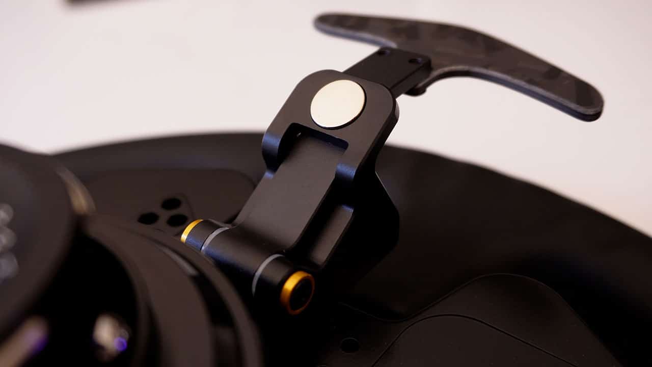 The shifters feel positive with a nice magnetic activation, and they feel a little lighter and easier to pull than those on the GS wheel. The rotary knobs on the front feel extremely high quality, while the push buttons are a little more plastic, but they do feel good to use.